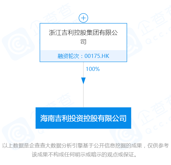12月27日,海南吉利投资控股有限公司成立,注册资本1亿元。股权穿透图显示,该公司由吉利汽车(00175.hk)全资控股。