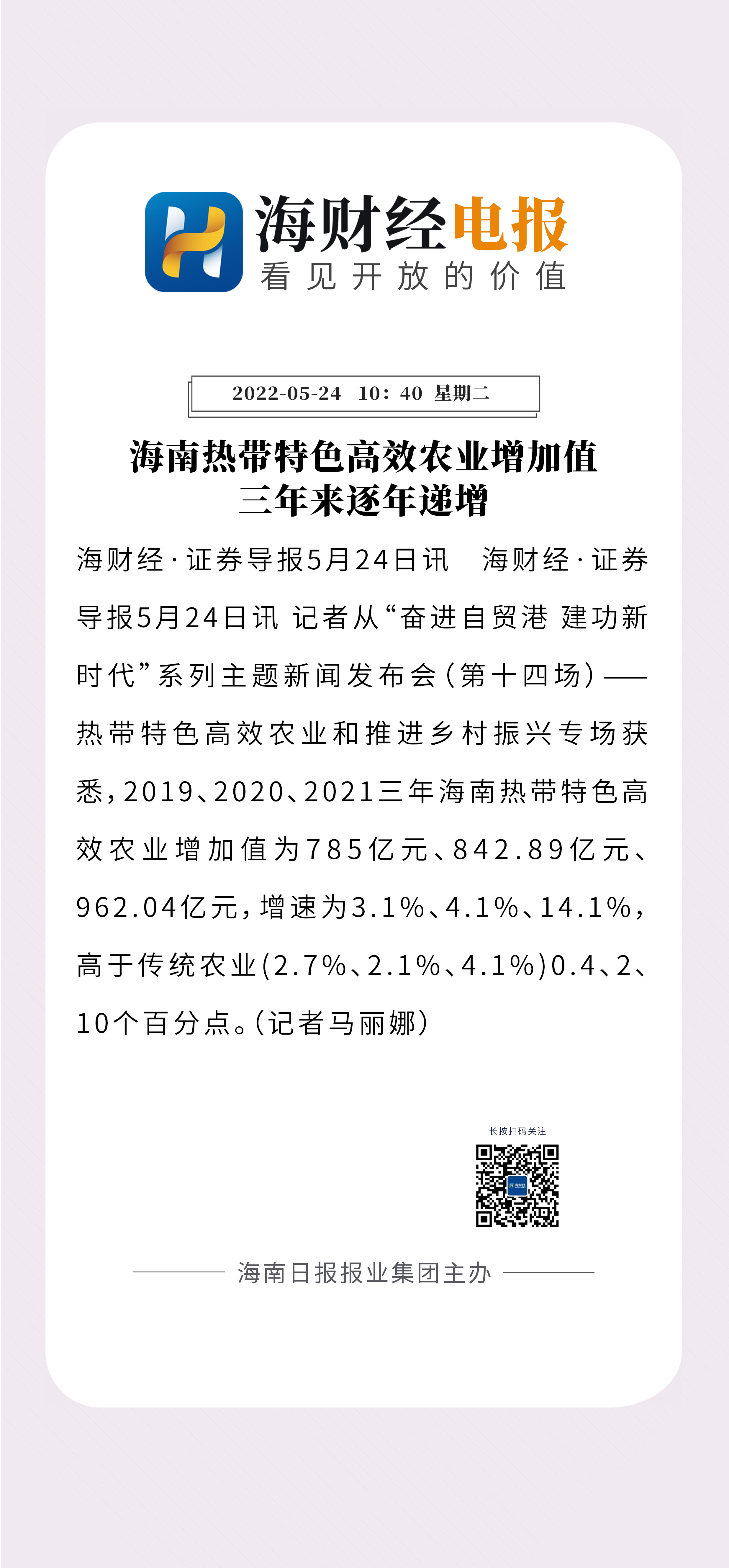 海财经·证券导报5月24日讯(记者马丽娜)记者从24日召开的“奋进自贸港 建功新时代”系列主题新闻发布会(第十四场)——热带特色高效农业和推进乡村振兴专场获悉,2019、2020、2021三年海南热带特色高效农业增加值分别为785亿元、842.89亿元、962.04亿元,增速为3.1%、4.1%、14.1%,高于传统农业(2.7%、2.1%、4.1%)0.4、2、10个百分点。