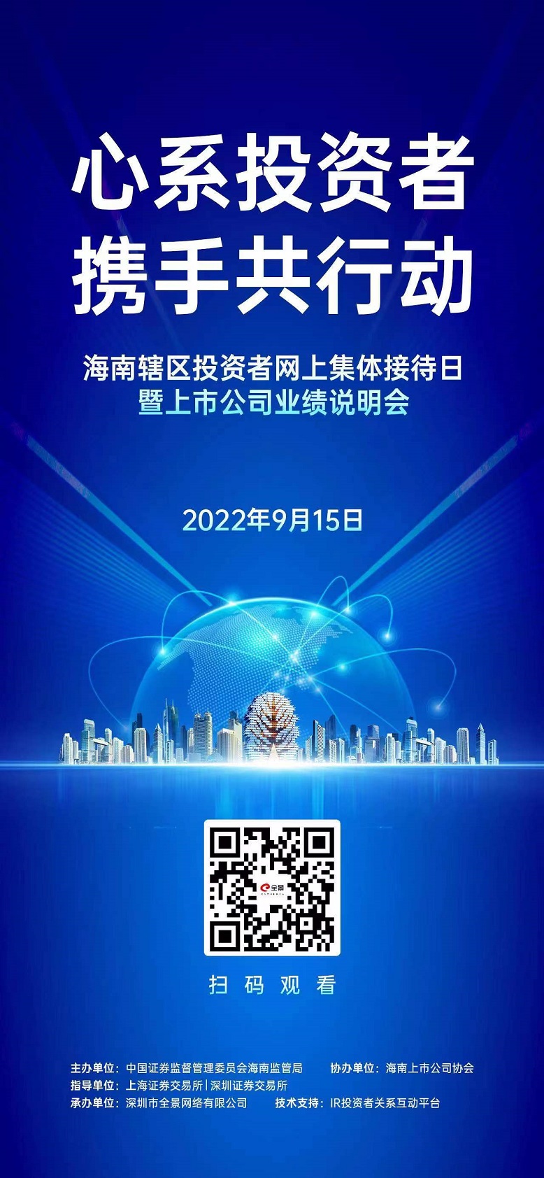 今年海南辖区投资者网上集体接待日暨上市公司业绩说明会的主题为“心系投资者 携手共行动”。会议议程显示,各上市公司与投资者通过网络在线交流形式,公司2021年年报和2022年半年报披露、财务数据、公司治理、内部控制、发展战略、经营状况、现金分红、重大事项、可持续发展等投资者所关心的问题,通过互动平台与投资者进行“一对多”形式的沟通。