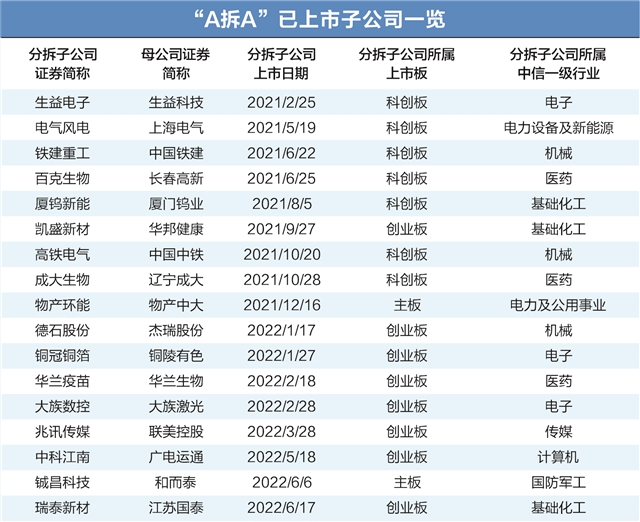 据记者统计,截至目前,累计已有17家A股上市公司分拆了17家子公司成功登陆A股市场。这17家公司全部为主板公司,分拆上市的17家子公司主要在创业板和科创板上市,在主板上市的只有2家。