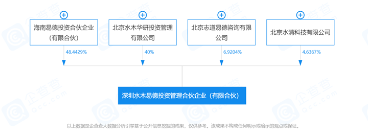 水木易德成立于2013年,认缴出资总额1445万元,经营范围包含权投资;投资管理;投资或创立科技型企业或其他企业和项目等。由海南易德投资合伙企业(有限合伙)(下称:海南易德投资)与北京水木华研投资管理有限公司等合伙人共同持股。