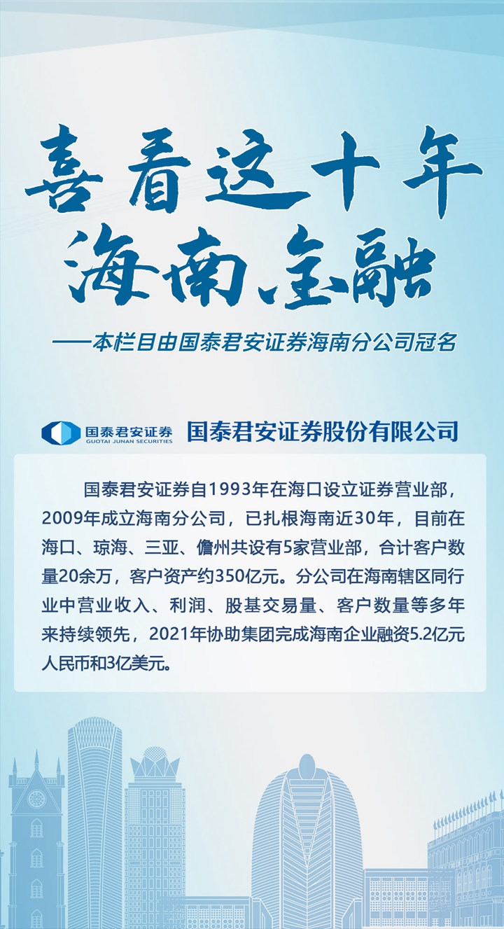 纵览十年跨越,踔厉再建新功。海财经·证券导报推出由国泰君安证券海南公司冠名的“喜看这十年·海南金融”栏目,用鲜活生动的案例、具体翔实的数据,展现十年间海南金融发展的新成就、新气象、新风貌。