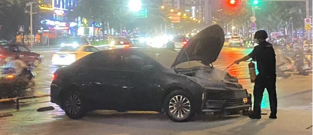 快速确认火情后,王定权立即扭头冲回支行拿起灭火器,仅30秒就赶到了车旁。此时车辆的自燃速度很快,车头已经燃起了熊熊大火,周边围满了市民,但没人敢上前灭火。这时,王定权快速打开灭火器,对准车头自燃位置进行喷射。几分钟后,在一瓶灭火器用完之时,火势也终于得到了控制。