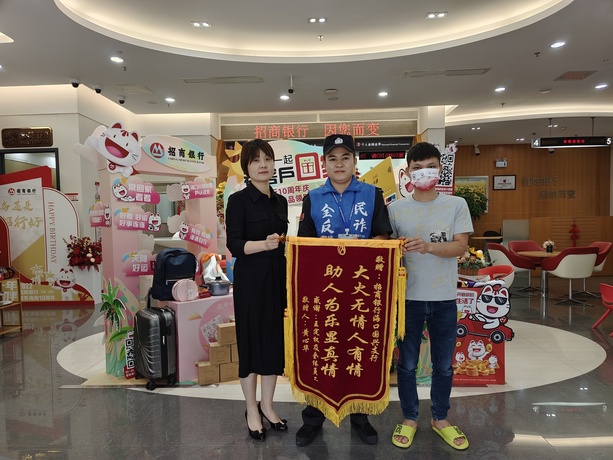 车主向王定权送锦旗表达感谢。招商银行海口国兴支行供图