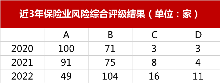 对比2021年末,纳入会议审议的保险公司中,C、D类公司数量均有所增加,其中风险严重的D类公司数量涨幅最快,增加了7家;风险较大的C类公司数量为2021年末的两倍,达到16家。