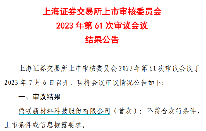 上交所上市委7月6日公告,鼎镁科技主板IPO审议结果为:不符合发行条件、上市条件或信息披露要求。
