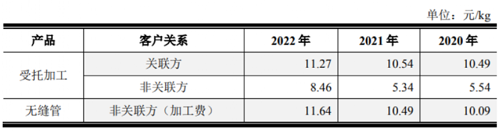 例如,公司受托加工业务平均单价中,关联方分别为 10.49 元/kg、10.54 元/kg 和 11.27 元/kg,非关联方客户分别为 5.54 元/kg、5.34 元/kg 和 8.46元/kg。