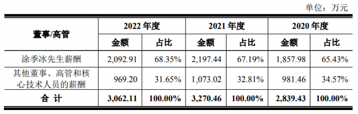 2020年至2022年,涂季冰从鼎镁科技领到的薪酬分别为1857.98万元、2197.44万元及2092.91万元,大约是同期其他董事、高管和核心技术人员薪酬总和的两倍。