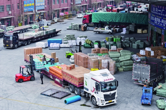 11月26日,在河北白沟新城东物流园区,货车在装卸货物(无人机照片) 新华社图