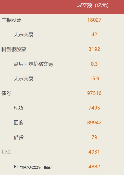 成交方面,主板股票成交额18027亿元,其中大宗交易 42亿元;科创板股票成交额3192亿元;债券成交额97516亿元。
