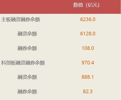 主板融资融券余额6236.0亿元,融资余额6128.0亿元,融券余额108.0亿元;科创板融资融券余额970.4亿元。