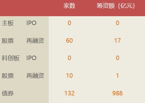 筹融资方面,主板IPO为0家;再融资60家,筹资额17亿元;科创板股IPO为0家,再融资10家,筹资额1亿元。