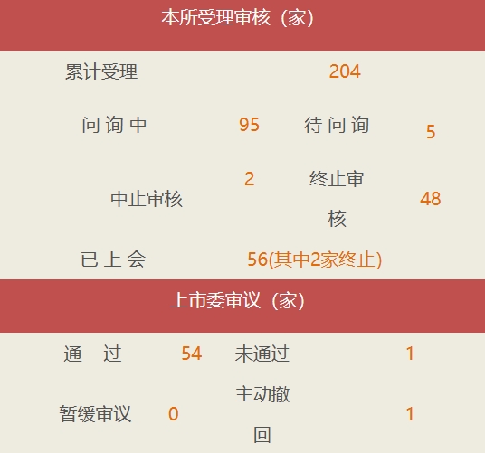本周主板项目动态显示,上交所累计受理审核204家,问询中95家;上市委审议通过54家,未通过1家, 主动撤回1家。向证监会提交注册43家,同意35家,过程中为8家。发行中2家,已获注册批复6家。