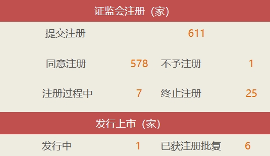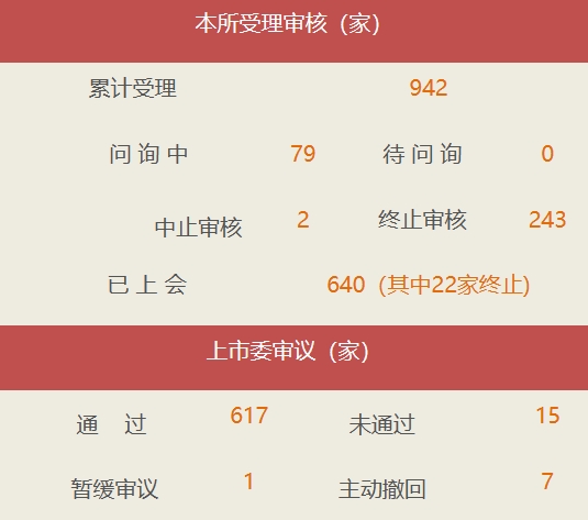科创板项目动态显示,上交所累计受理审核942家,上市委审议通过617家,未通过15家,暂缓审议1家,主动撤回7家。向证监会提交注册611家,同意578家,过程中为7家。发行中1家,已获注册批复6家。