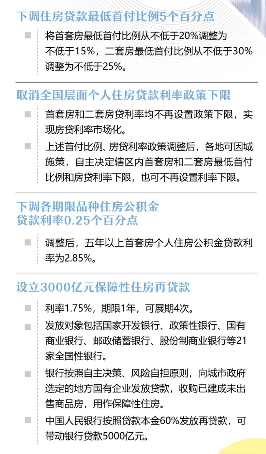 新一轮支持房地产的金融举措“四连发”:明确取消全国层面房贷利率政策下限、下调房贷首付款比例和公积金贷款利率、设立保障性住房再贷款,支持力度可谓空前。