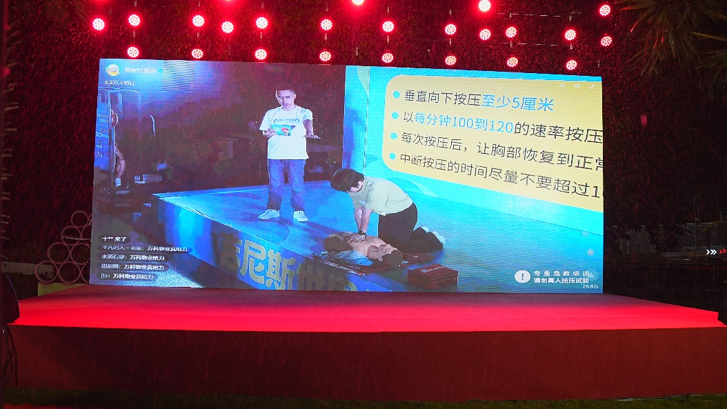 当晚18:55,一场“定制平台上实时观看人数最多的CPR培训课程”吉尼斯世界纪录挑战在全国万个家庭同步展开。观众通过万科物业“邻居好服务”视频号直播间学习心肺复苏(CPR)急救知识,直播间实时观看人数最高达20917人,直播总观看人数超过10万人次,三亚的万科物业业主们共同见证了这场意义非凡的生命教育盛宴。这是朴里节首次将万物云“G4行动”全面融入社区节日,推动社区安全建设从基础服务升级为居民广泛参与的共建行动,这一创新旨在将应急救援能力从物业的技能储备,扩展为包括业主、街道人员在内的社区整体应急响应能力的提升。