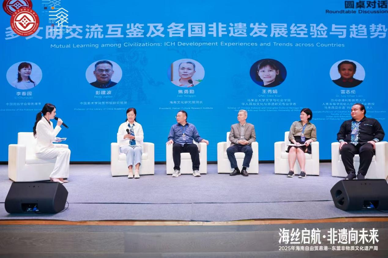 在圆桌对话环节,中国民俗学会常务理事李春园,中国美术学院图书馆研究馆员彭建波,海南大学人文学院教授、海南文化研究院院长焦勇勤,马来亚大学文学与社会科学学院、华人民俗文化与非遗研究专业学者王秀娟,苏丹依德利斯教育大学人类发展学院幼儿创意艺术副教授、马来西亚非遗“玛蓉舞剧”传承人雷志伦等5位嘉宾共同勾勒出非遗在当代面临的伦理根基、创新路径、文化联结、演化逻辑与传承未来的多维图景。