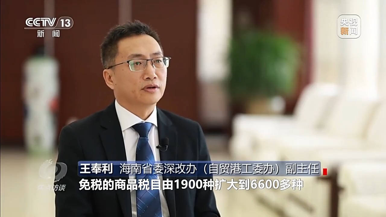 海南省委深改办(自贸港工委办)副主任 王奉利:封关之后,免税的商品税目由1900种扩大到6600多种,“零关税”水平由之前的21%提高到74%,加工增值超过30%销往内地还免关税。