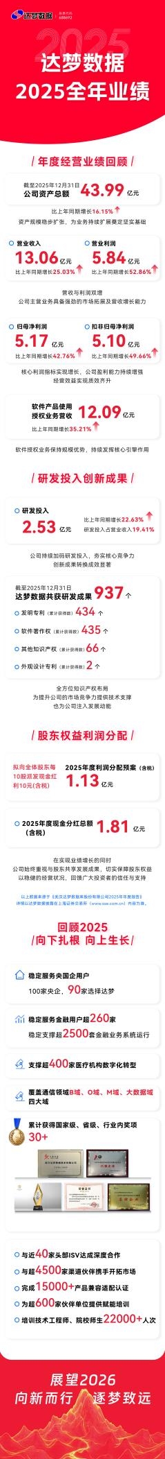截至2025年12月31日,达梦数据总资产额达43.99亿元;2025年,实现总营收13.06亿元,同比增长25.03%;归母净利润5.17亿元,同比增长42.76%,扣非归母净利润5.10亿元,同比增长49.66%。